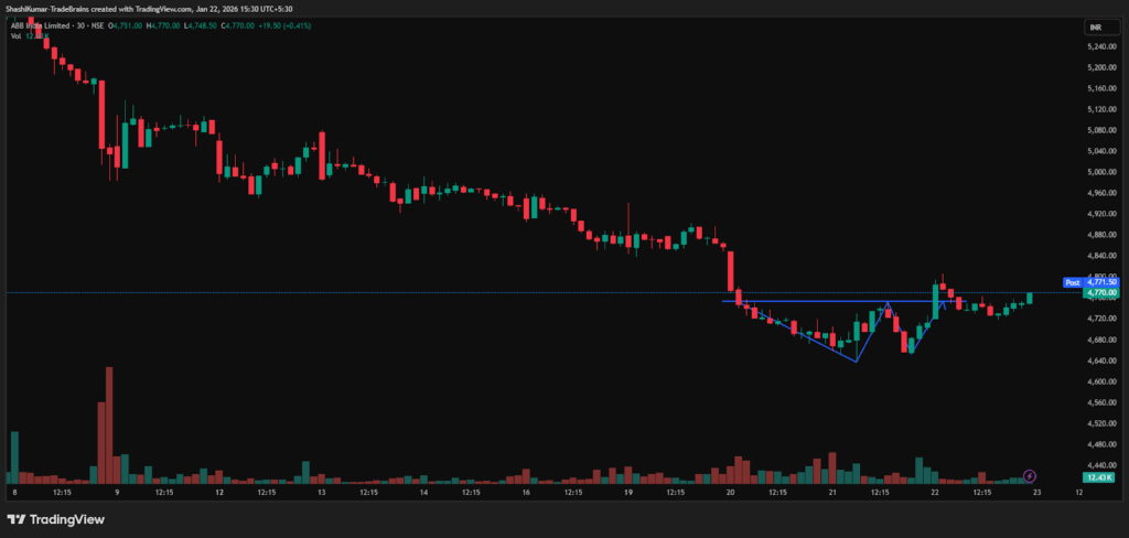 Synopsis: ABB India Ltd has exhibited a bullish reversal pattern on its 30 min chart, signalling potential near-term upward momentum.