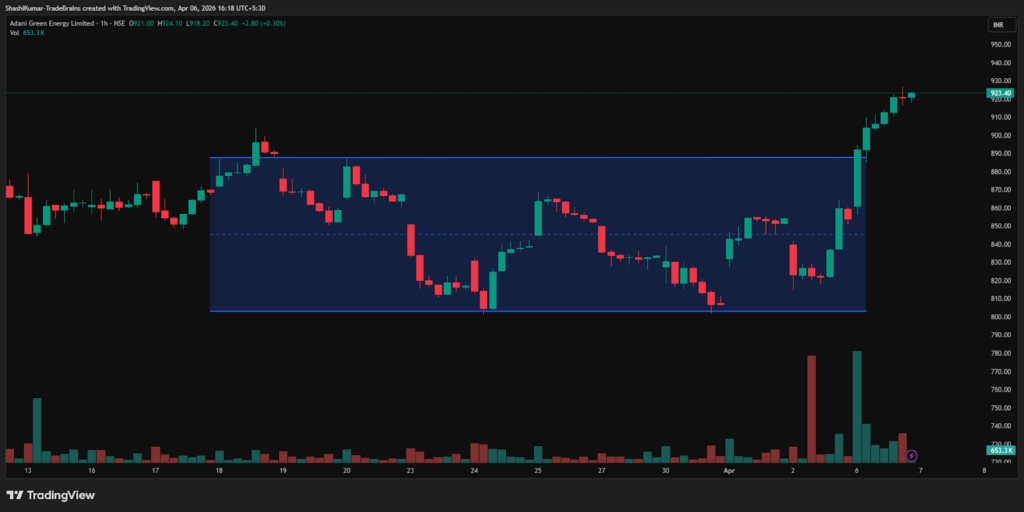 Synopsis: Adani Green Energy Ltd has formed a rectangular channel on the 1-hour chart, and an upside breakout indicates a bullish bias. Adani Green Energy Ltd, following a phase of sideways consolidation in recent sessions, has developed a rectangular channel pattern on its 1-hour chart. A rectangular channel shows consolidation within parallel support and resistance […] The post Adani Green Energy Forms Bullish Rectangular Channel Breakout; Check the Chart and Details appeared first on Trade Brains.
