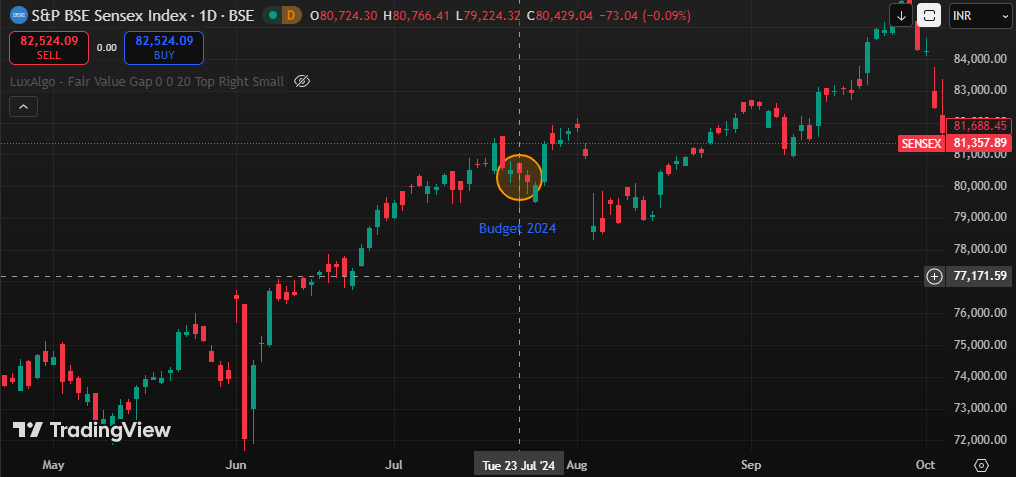 The full Union Budget on July 23, 2024 saw the Sensex open at Rs. 80,724.30, touch Rs. 80,766.41 and close at Rs. 80,429.04, down 0.09 percent. Earlier, the Interim Budget on February 1, 2024 had the Sensex open at Rs. 71,998.78, rise to Rs. 72,151.02 and close at Rs. 71,645.30, declining 0.15 percent. On the July Budget day, the Nifty opened at Rs. 24,568.90, hit Rs. 24,582.55 and ended at Rs. 24,479.05, down 0.12 percent.