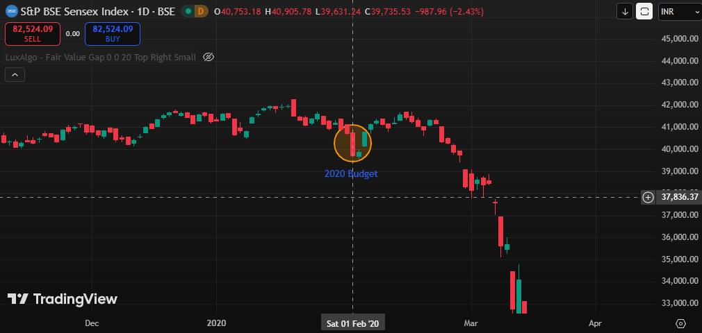 On February 1, 2020, the Sensex opened at Rs. 40,753.18, reached a high of Rs. 40,905.78 but closed sharply lower at Rs. 39,735.53, recording a fall of 2.43 percent. The Nifty 50 started the day at Rs. 11,939, rose to Rs. 12,017.35 and ended at Rs. 11,661.85, down 2.51 percent. This was the second Budget of the Modi-led NDA government’s second term, and at 2 hours and 41 minutes, it became the longest Budget speech in Indian history.