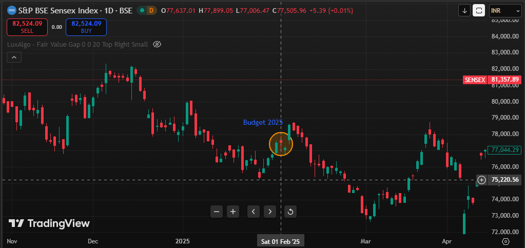 On February 1, 2025, the Sensex opened at Rs. 77,637.01, touched a high of Rs. 77,899.05 and closed at Rs. 77,505, falling 0.01 percent. The Nifty 50 opened at Rs. 23,528.60, reached Rs. 23,632.45 and ended at Rs. 23,482.15, down 0.11 percent. The Budget focused on tax relief, innovation, urban development and job creation.