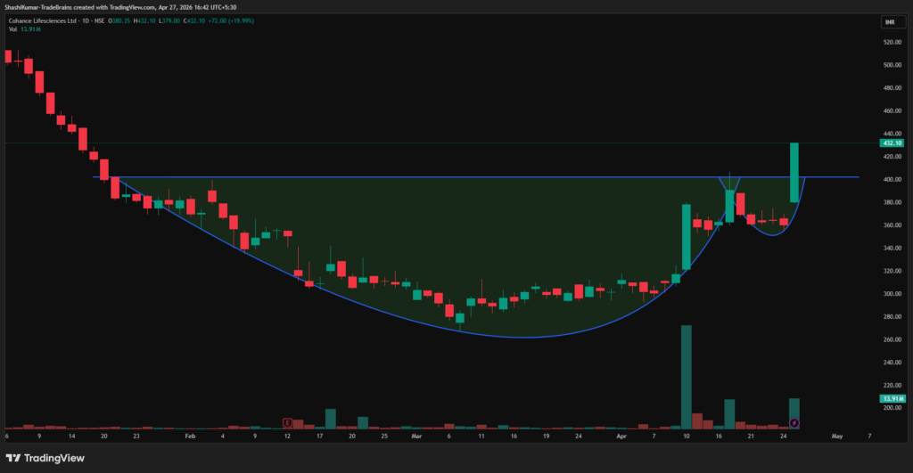 On 27th April 2026, Cohance Lifesciences Ltd broke above the resistance neckline of a cup & handle pattern on the daily chart. A sustained move above Rs 403 could pave the way for further upside, while a drop below this level may weaken the bullish outlook.