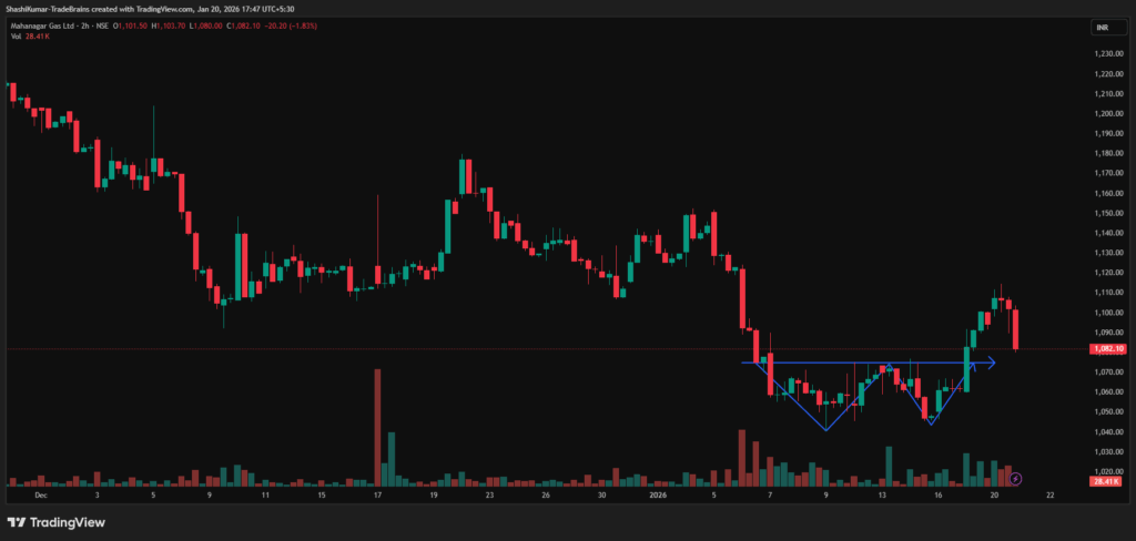 Synopsis: Mahanagar Gas Ltd has formed a double bottom pattern on the 2-hour chart, indicating a potential near-term bullish reversal.