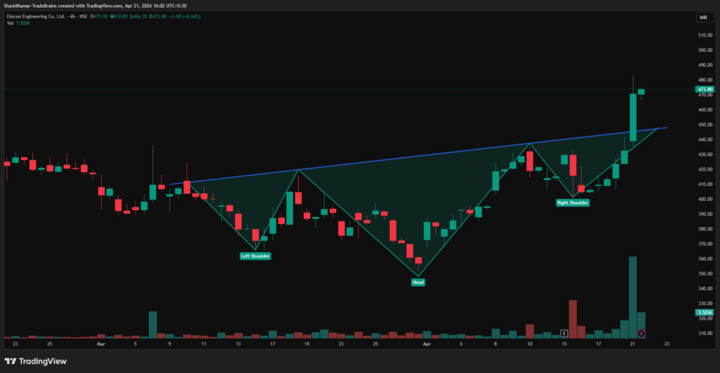 Synopsis:Elecon Engineering Company Limited has formed an inverted head-and-shoulders pattern on the 4-hour chart, signalling a potential near-term bullish reversal.