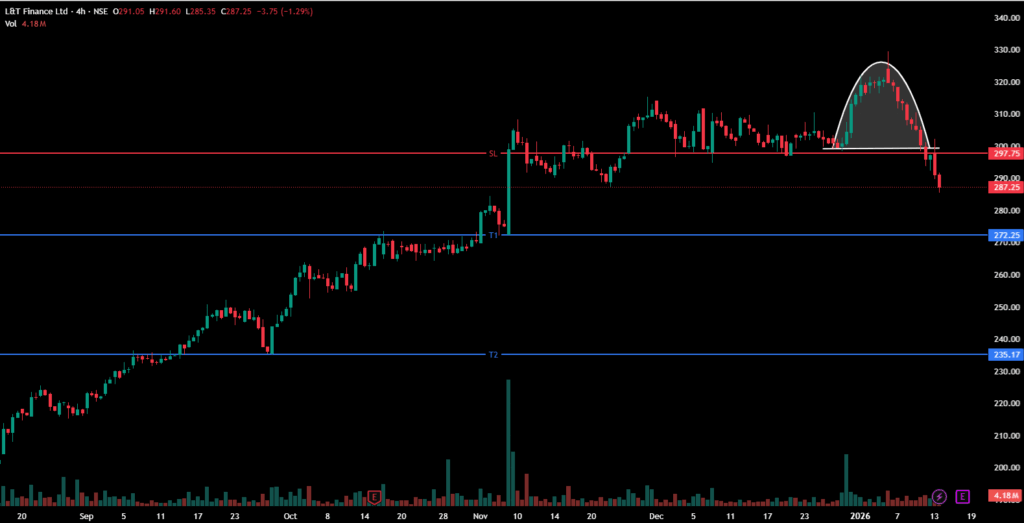 L&T Finance Ltd, after a sustained uptrend followed by sideways consolidation in recent sessions, has formed a rounding top pattern on its 4-hour chart, with the downside breakout signalling a potential continuation of bearish momentum.