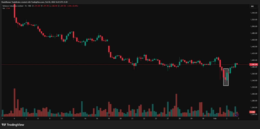 Synopsis: Reliance Industries Ltd formed a Bullish Engulfing pattern on the 1-hour chart, signaling a potential near-term bullish reversal.