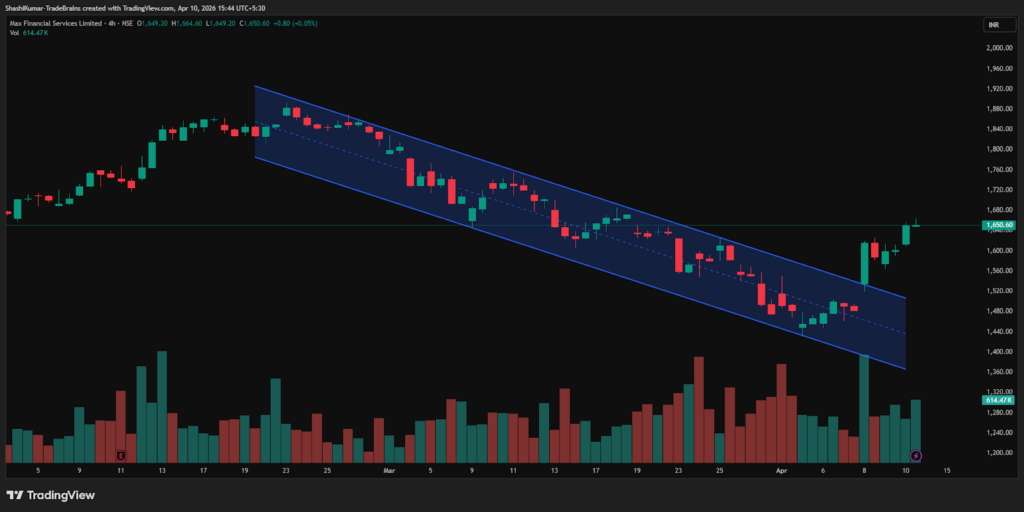 On 8th April 2026, Max Financial Services Ltd broke above the descending channel above the key resistance level of Rs 1,500, sustaining the move through 9th & 10th April 2026. The breakout, backed by healthy volumes, indicates emerging near-term bullish momentum.