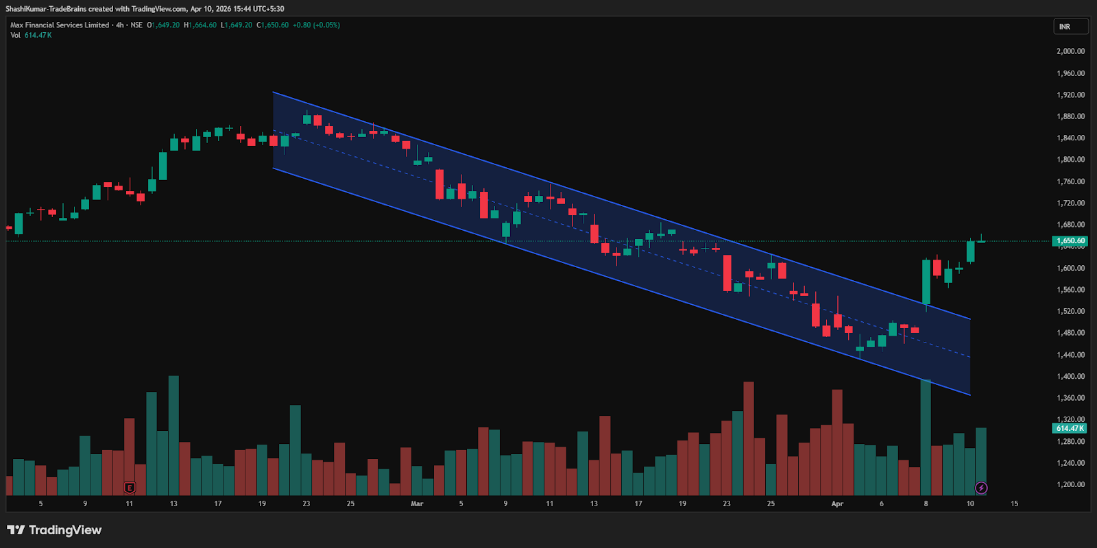 Synopsis: Max Financial Services Ltd has broken out of a descending channel on the 4-hour chart, signalling a short-term bullish trend.