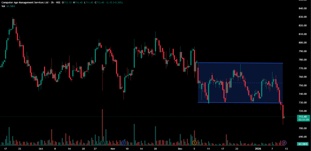 On Friday, CAMS formed a lower high within the rectangular consolidation channel, before decisively breaking below the key support level of Rs 730 on Monday. The breakdown, coupled with subdued buying volumes, signals the emergence of near-term bearish momentum.