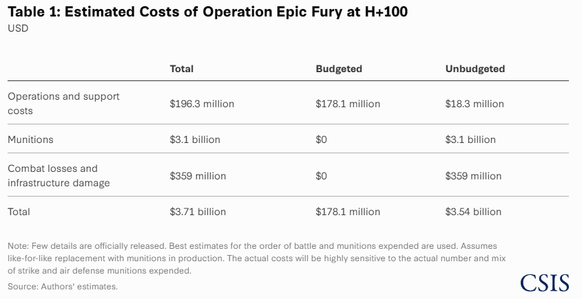 According to the Center for Strategic and International Studies (CSIS), the cost of the war for the United States is already enormous. The first 100 hours of the operation were estimated to cost about USD 3.7 billion, or roughly USD 891.4 million per day. Of this, around USD 196 million came from operational costs, with USD 178 million already budgeted and the rest unbudgeted. Another USD 3.1 billion was tied to replacing munitions, none of it budgeted, while an additional USD 350 million was estimated for replacing combat losses and repairing damaged infrastructure, also unbudgeted.