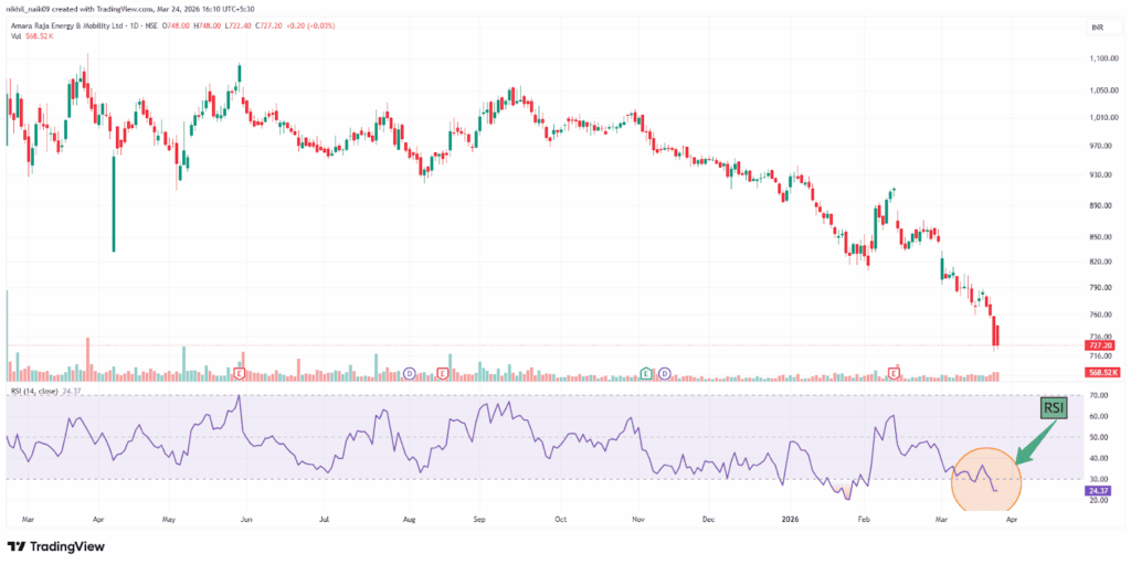 With a market capitalization of Rs. 13,308.69 crores on Tuesday, the stock closed at Rs. 727.15, with an RSI of 24.37, indicating that it is in the oversold zone, offering the potential for an upside bounce.