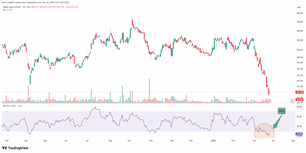 With a market capitalization of Rs. 74,761.04 crores on Tuesday, the stock closed at Rs. 421.50, with an RSI of 24.48, indicating that it is in the oversold zone, offering the potential for an upside bounce.