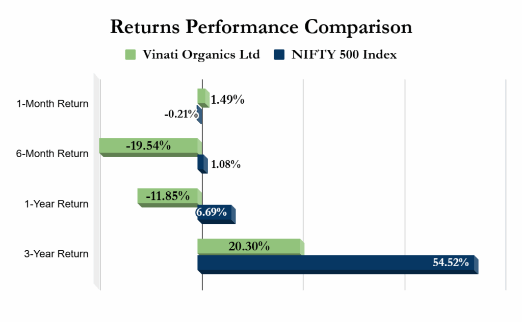 A comparison of Vinati Organics Ltd with the NIFTY 500 Index shows underperformance across most time frames. Over the short term, Vinati Organics delivered a positive 1-month return of 1.49%, outperforming the NIFTY 500, which declined by -0.21%. However, in the medium to long term, the stock lagged the broader market, posting a 6-month return of -19.54% and a 1-year return of -11.85%, compared with gains of 1.08% and 6.69% for the NIFTY 500. Over three years, Vinati Organics returned 20.30%, significantly lower than the index’s strong 54.52% return, indicating relative underperformance in long-term wealth creation.